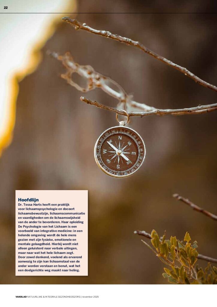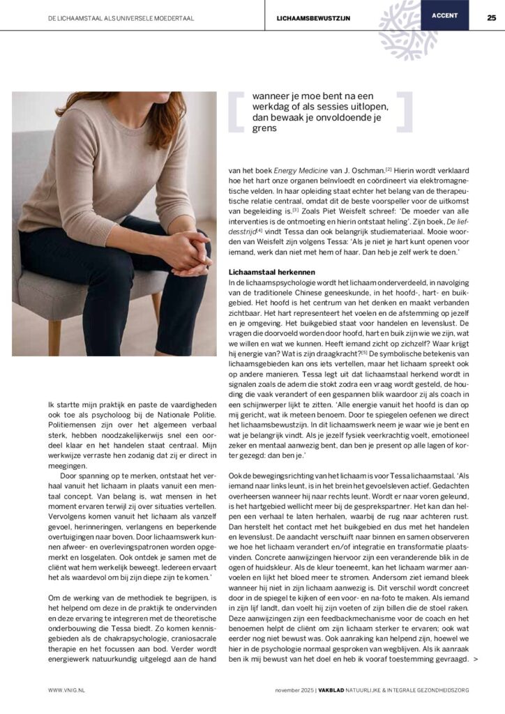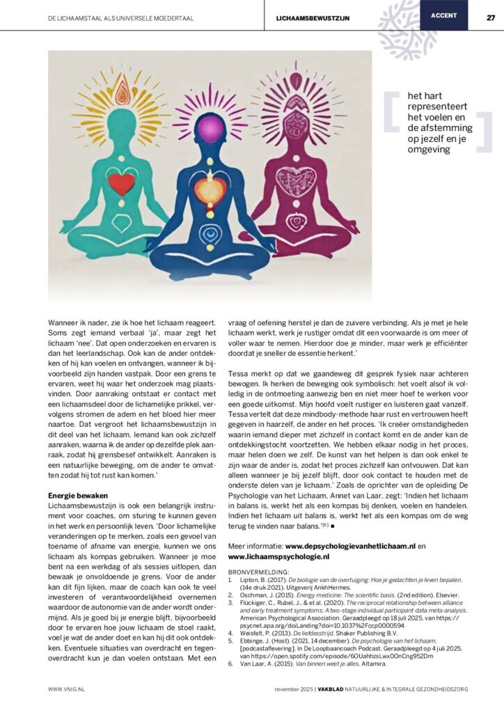 In de zomer sprak in Met Sanderijn Hubertse. Zij interviewde me voor het vakblad voor Natuurlijke en Integrale gezondheidszorg www.vnig.nl voor hun themanummer over lichaamsbewustzijn. Hieronder het artikel dat dit najaar uitkwam. Wil jij je lichaamsbewustzijn vergoten en lichaamstaal inzetten in je werk als professioneel begeleider? In maart start level 1 masterclass Lichaamswijsheid herkennen en toepassen. Je kunt ook komen ervaren en kennismaken op 3 februari bij de introductieworkshop.